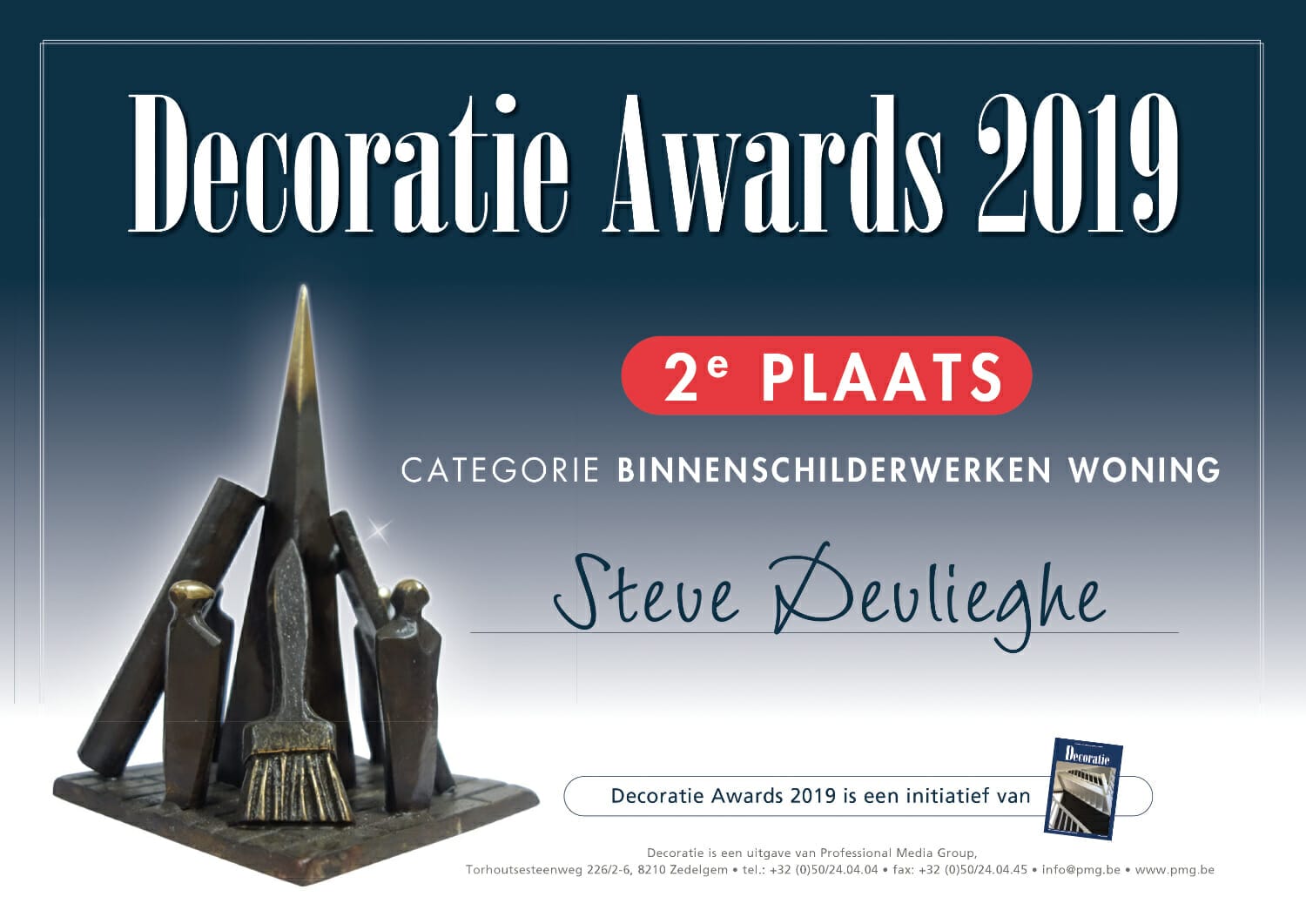 Steve en zijn schildersteam weten exact hoe ze uw interieur een geslaagde make-over moeten geven. In 2019 behaalden ze zelfs de tweede plaats op de Decoratie Awards in de categorie “Binnenschilderwerken woning”. Bij elke interieuropdracht is Steve persoonlijk op de werf aanwezig. Hij hecht veel belang aan een duidelijk contact met zijn klanten en geeft uitgebreid advies waar nodig.